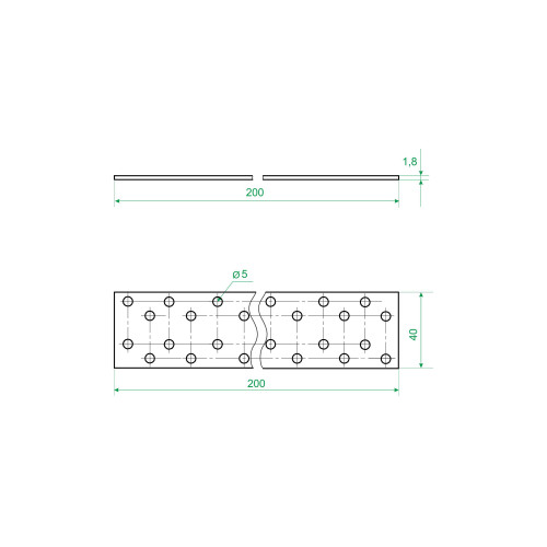 Пластина изготовлена из оцинкованной стали толщиной 1,8 мм, снабжена перфорацией. Размер — 40 × 200 мм, цвет — серебро.