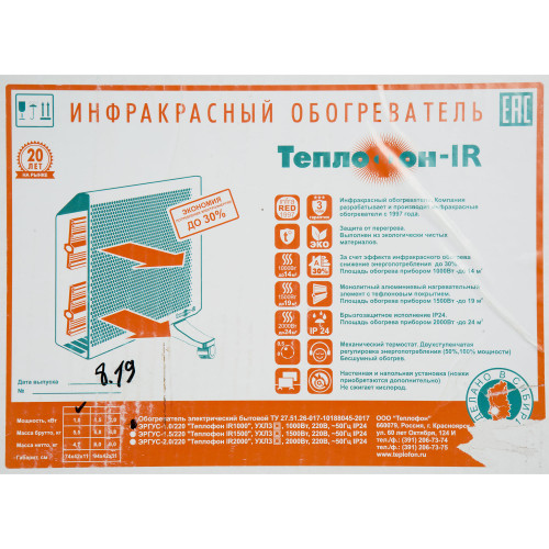 Обогреватель инфракрасный электрический Теплофон IR1/22 1000 Вт