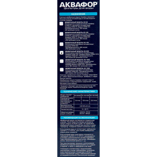 Мембрана для обратного осмоса «Аквафор» К0-50S — сменный мембранный модуль для автоматов питьевой воды «Аквафор» DWM-70S, DWM-101S Морион, DWM-201. Изделие предназначено для очистки воды от солей жесткости, органических и неорганических соединений. Кроме того, уникальная мембранная система устраняет бактерии и простейшие микроорганизмы. После фильтрации по вкусовым качествам и химическому составу вода приближена к талой.
