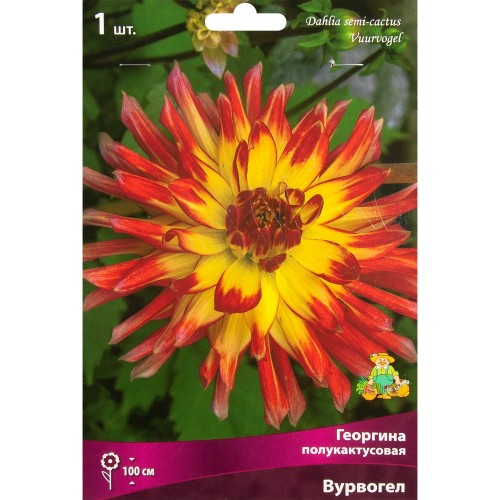 Георгина полукактусовая Вурвогел луковица I Являются переходным вариантом между кактусовыми и декоративными георгинами. Лепестки более широкие у основания и свернуты в трубочку только на половину (или менее) длины, как правило прямые и расходящиеся во все направления от центра. Форма цветка махровая. Высота растения 100 см. Цветок диаметром 15 см, желтый, с ярко-красными кончиками, лепестки волнистые.