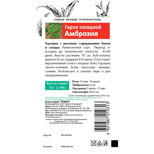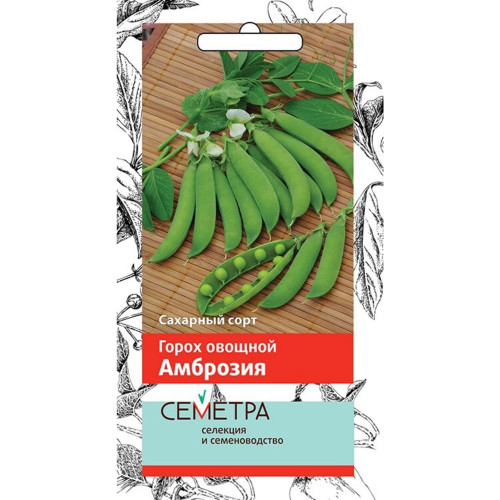 Горох овощной «Амброзия» — сорт с мясистыми, сладкими бобами с высокой концентрацией белка. Растение среднерослое (до 70 см), формирует стручки-лопатки, в каждом из которых созревает до 9 горошин. Пергаментный слой на створках отсутствует. Технической спелости плоды достигают на 45-60 день от появления всходов, употребляются в свежем виде и для заморозки.